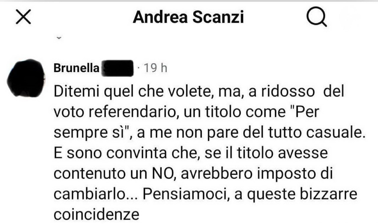 C’è un post che circola da qualche giorno sulla pagina di Andrea Scanzi. Lo scrive una certa Brunella, e il ragionamento è, diciamo, lineare nella sua semplicità: siamo a ridosso del voto referendario, Sal Da Vinci porta a Sanremo una canzone che si intitola “Per sempre sì”, e questa cosa a lei non sembra del tutto casuale. Anzi, è convinta che se il titolo avesse contenuto un “no”, qualcuno avrebbe imposto di cambiarlo. E chiude con un invito alla riflessione collettiva su queste “bizzarre coincidenze”.
